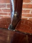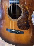 Original shaded top that was refinished in 1994. At that time they attempted to "secure the neck to body" based on an old repair ticket. They drilled through the end of the neck heel all the way through the head block, flooded it with epoxy, inserted a dowel rod and clamped it up. They shaved the bridge down a little to compensate for the neck angle and did a refret with a bone nut. There was also damage to the side that was repaired and a bridge plate doubler was added.